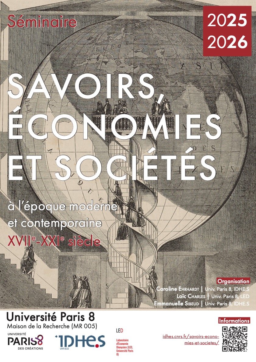 Au carrefour de l’histoire sociale, de l’économie et de l’histoire des savoirs, ce nouveau séminaire réunit les chercheur·es et les doctorant·es de l’équipe Institutions et Dynamiques Historiques de l’Économie et de la Société (UMR 8533) à Paris 8 et de l’axe “histoire” du Laboratoire d’Économie Dyonisienne (UA 3391). Les séances sont basées sur une présentation d’une recherche en cours sur la période moderne ou contemporaine. Elles seront l’occasion d’explorer ces sujets dans une perspective globale et résolument pluridisciplinaire.
